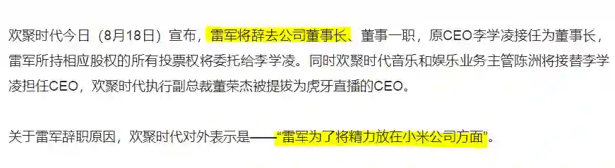 实际上在2016年8月之前,雷军是欢聚时代的董事长