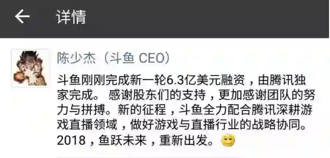 昨天上午11点54分,主打游戏直播的斗鱼CEO陈少杰在朋友圈宣布: