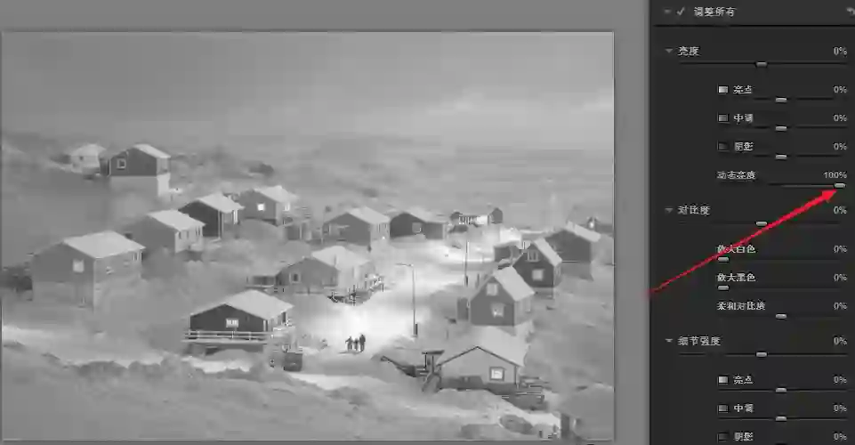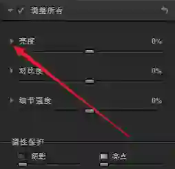 展开“调整所有”板块,可以看到“亮度”、“对比度”、“细节强度”等几个参数滑块。