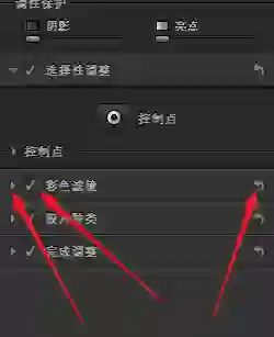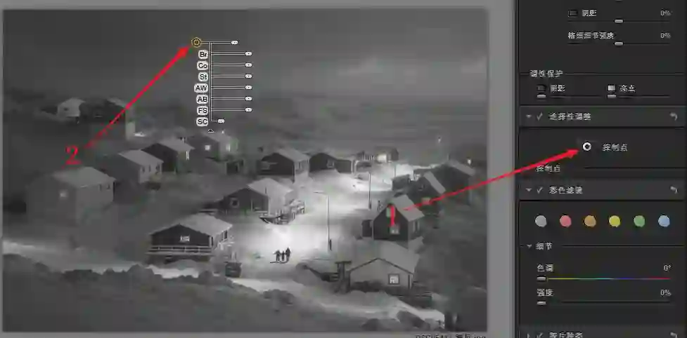 单击下图箭头1所示的,”选择性调整“板块中的”控制点“图标。然后点击画面中的某个物体,就可以在那里建立一个控制点。