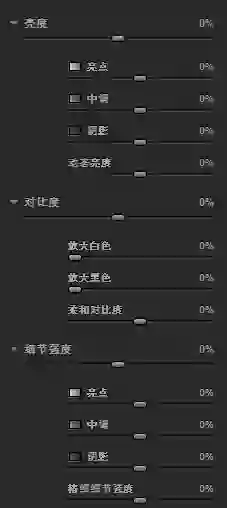 ”亮度“滑块下面,还有”亮点“、”中调“和”阴影“三个分滑块,分别控制画面中的亮部、中间调和暗部区域。