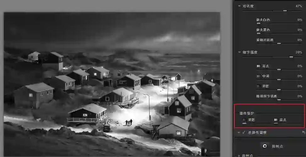 以上就是后期黑白处理中,最为重要的“调整所有”和“选择性调整”板块。