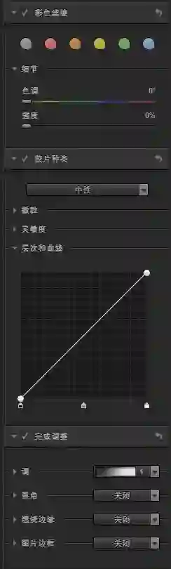 参数界面下面的“彩色滤镜”、“胶片种类”、“完成调整”板块,我会在未来的教程中详细讲解。