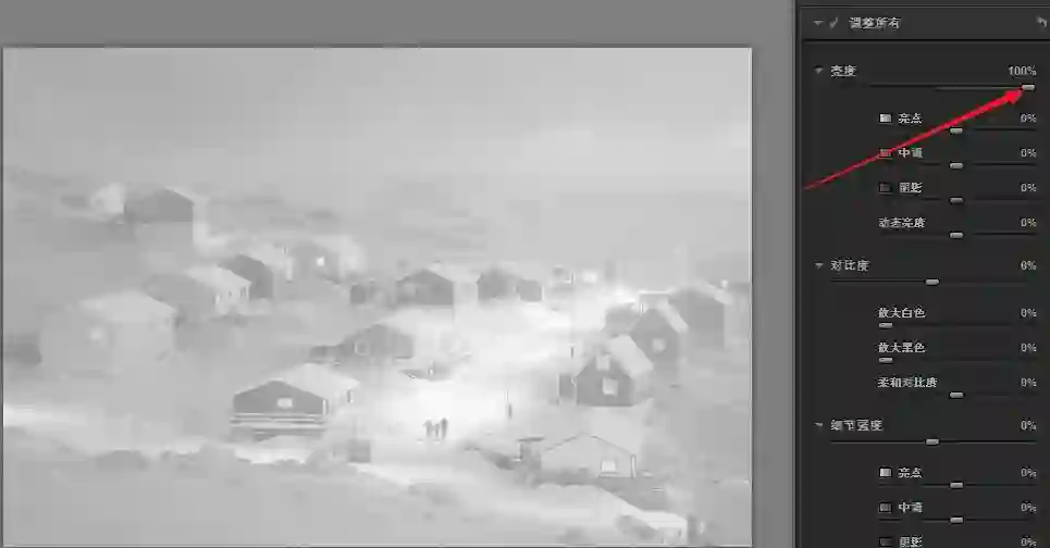 当我们移动”亮度“滑块,画面中所有的地方都会一起变亮变暗,画面的对比反差程度会有所降低,细节看起来不再清楚。