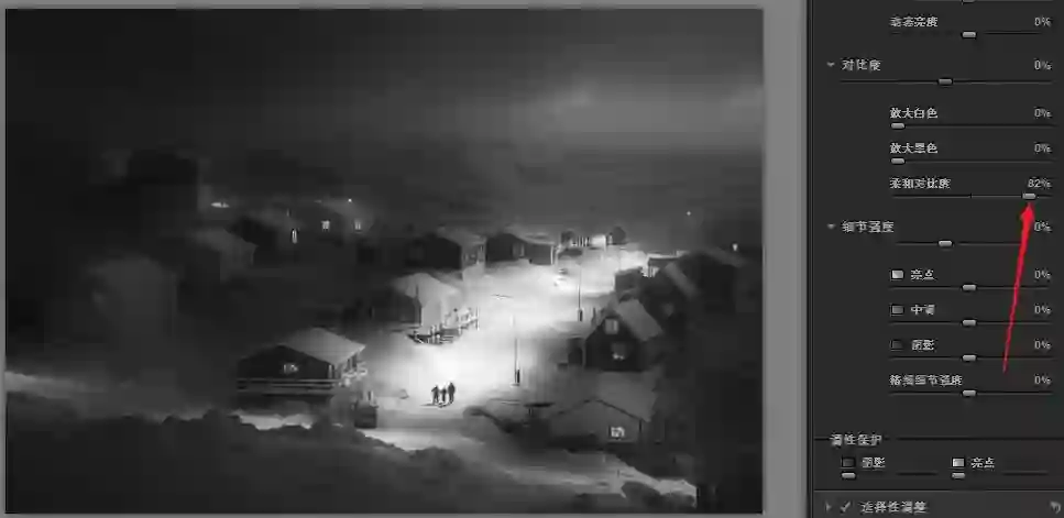 最后还有一个”柔和对比度“的滑块。这个滑块的算法比较特别,它会识别出画面中的亮区和暗区,并在亮暗交界的部分,弱化原有的生硬边缘,生成一个柔和的明暗过渡。