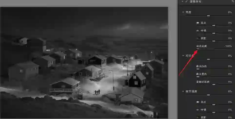 比如我右移”动态亮度“滑块,可以看到画面整体提亮了,但画面的暗部区域的提亮幅度,比使用”亮度“滑块时低了很多。这样画面中仍然有很暗的部分,整体提亮后依然反差和细节十足。