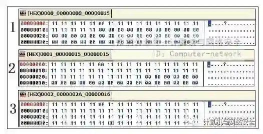 将MyCCL文件的分块个数设置为3,MyCCL会将“例子.exe”按照其特有的填充方式生成3个文件,并用“00”填充不同的位置。第一次分为如图12所示的3个文件。由图12可知,第一个文件暴露出了1/3的数据,剩下的被“00”填充了,第二个文件暴露了2/3的数据,而第三个文件则全部暴露了。根据MyCCL生成文件的规律可知,它生成第一批文件采用的是由头到尾的暴露方式。但是在图中可发现,这3个文件或多或少都含有特征码,当反病毒软件将这3个文件全部删除后,用MyCCL生成了第二批文件。