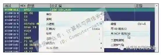 3)返回"0x0100FAEE"处,右键单击这句指令,在弹出的对话框中依次选择“二进制”→“用NOP填充”,如图43所示。然后再以同样的方式将地址"0x0100FAF0"与"0x0100FAF2"的内容也用NOP填充(在操作之前将位于这两个地址后面的汇编指令保存在记事本里)。