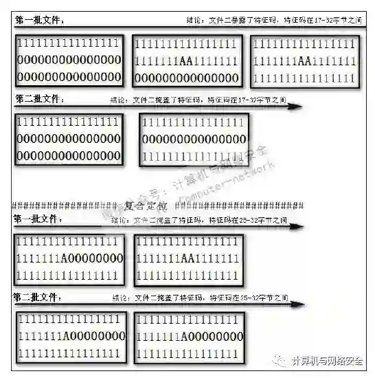 特征码的混合定位一般是应用二分法或逐块暴露法定位出含有特征码的较小区域,然后再采用逐位测试法探测出特征码的具体位置及长度。