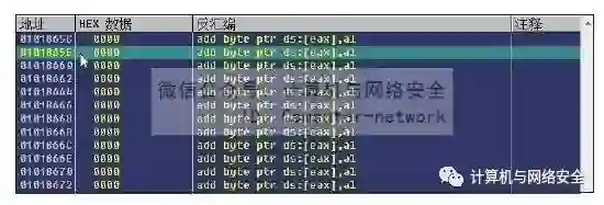 2)找到如图42所示的一处空白区域,并记住其中的任意一个地址,这里选择的是"0x0101865E"这个地址。