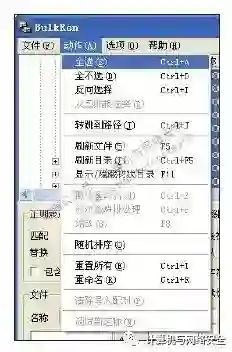 单击“<生成>”按钮后,运行文件名批量更改工具Bulk Rename Utility,打开特征码样本文件夹OUTPUT,依次单击菜单栏的“动作”→“全选”,如图24所示。