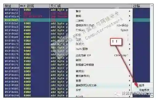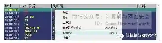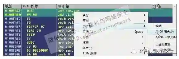 4)选中刚刚NOP的语句,在"0x0100FAEE"行单击右键,在弹出的如图44所示的菜单中选择“汇编”,然后写入指令jmp 0x 0101865E,无条件跳转到刚才找到的那个空白地址处。
