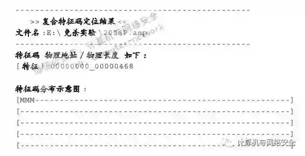 因此,第一次完全可以少生成一些,例如先定位出500字节的特征码,由于文件的绝大部分区域不含有特征码,所以在二次复合定位时完全可以把那些不含特征码的区域忽略掉,这样一来就可以在极小的区域内查找特征码了。如果就像上面所说的,第一次定位出500字节精度的特征码,那么进行第二次符合定位时,只需生成250个特征码样本即可完成特征码的查找工作。这样一来总共生成的文件不超过2000个,效率一下提高了200多倍。