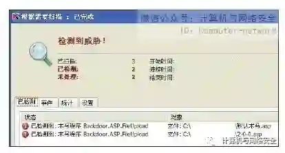 然后用反病毒软件查杀,发现“默认木马.asp”与"2-0-0.asp"被查杀了,如图3所示。这就说明文件"2-0-0.asp"里含有特征码,下面我们再将"2-0-0.asp"分为两份,继续进行查杀,如果发现哪个文件有病毒就再次将其分割,直到将文件分割到足够小,方便我们更改特征码为止。这里假设我们定位出了特征码在"<%err.clear%>"里,那么只需将其字母大小写进行替换就可以了,例如替换为"<%ErR.clEaR%>"即可免杀。