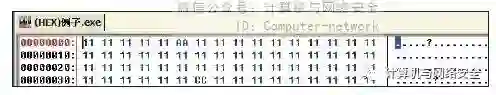 为了更加直观地介绍各个特征码定位器的原理,制作了一个极其简单的例子程序,如图5所示。当然这个程序是不能运行的,只是为了演示所用。这个程序中的"1111……"代表的是有数据的地方,其中的"AA"就是我们假定的特征码。