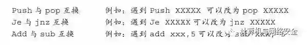 上面3条指令的应用方法非常简单,就是一个替换的问题。我们重点讲解一下“Add与sub互换”。Add与sub在汇编里分别是加与减的意思,例如add xxx,5就是将"xxx"加上5的意思,很显然,sub xxx,-5则是将"xxx"减去-5的意思。但是我们仔细地想一想,加5与减去-5在结果上有何不同呢?很显然它们取得的结果是一样的啊!既然取得的结果一样,自然也就不会对程序的运行产生影响了,因此就可以利用这个原理来将这两个指令调换着使用。但是需要注意的是,这里加减运算所应用的都是十六进制数据。