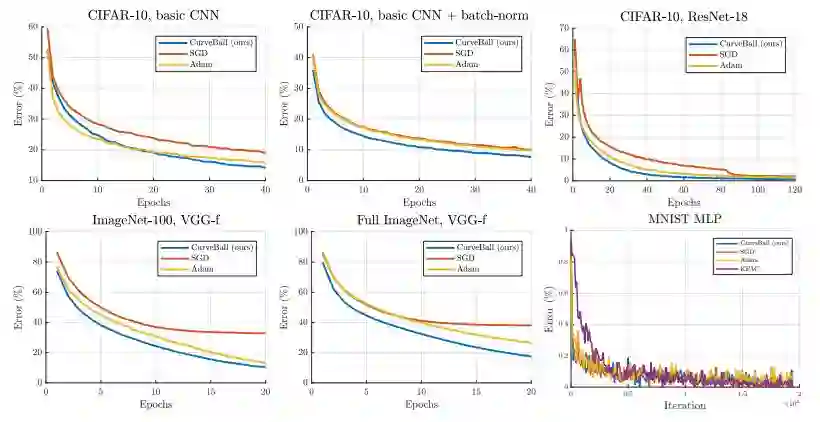 我们提出了一种能直接替换现今深度学习求解器的快速二阶方法。与随机梯度下降法(SGD)比,它只需要在每次迭代时进行 2 次额外的前向自动微分操作,同时它的运算成本与 2 次标准前向传播相当且易于实现。我们的方法解决了现有二阶求解器长期存在的问题,即在每次迭代时需要对黑塞矩阵的近似精确求逆或使用共轭梯度法,而这个过程既昂贵又对噪声敏感。相反,我们提出保留逆黑塞矩阵投影梯度的单个估计,并在每次迭代时更新一次。这个估计值有着相同的维度,并与 SGD 中常用的动量变量相似。黑塞矩阵的估计是变动的。我们首先验证我们的方法—CurveBall 在一些已知闭式解的小问题(带噪声的 Rosenbrock 函数和退化的 2 层线性网络)上的有效性,而这是现今深度学习解释器仍在努力的地方。我们接着在 CIFAR、ImageNet 上训练一些大型模型,包括 ResNet,VGG-f 网络,我们的方法在没有调整超参数的情况下,表现出更快的收敛性。最后,所有的代码已经开源。