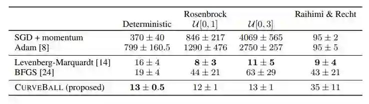表 1:在小数据集上优化器的比较。对于每一个优化器,我们展示了解决问题所需迭代数的平均值 ± 标准差。对于随机 Rosenbrock 函数,U[λ1, λ2] 表示来自 U[λ1, λ2] 的噪声(详见 4.1)。