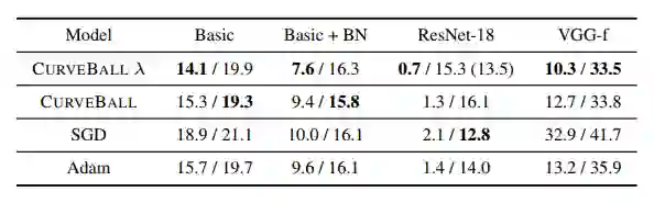 表 2:不同模型和优化方法的最佳百分比误差(训练/验证误差)。CURVEBALL λ 表示使用了重新调整的参数 λ(第 3 节)。括号内的数字表示带有额外 Dropout 正则化(比例 0.3)的验证误差。前 3 列在是在 CIFAR - 10 上训练的,第 4 列是在 ImageNet - 100 上训练的。