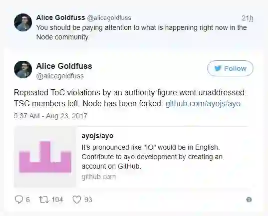 而且现在由于“行为准则”的执行力不足,不仅造成了 Node.js 的分叉,还导致一名 Node.js 委员会成员在 TSC(技术指导委员会)上辞去自己的职务。