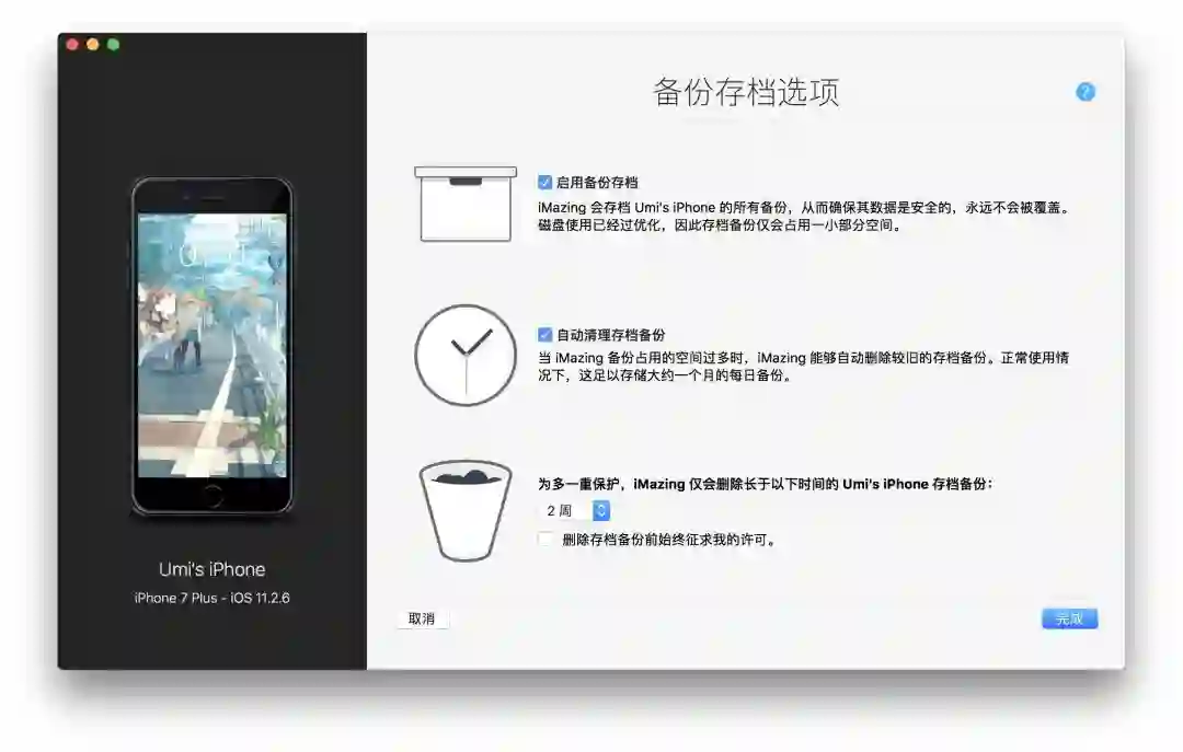 而 iMazing 等第三方软件还会在储存空间不够时自动删除旧备份,也允许你自动删除一定时间前的备份,更为方便。