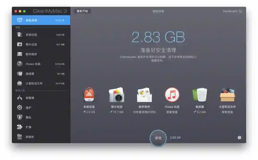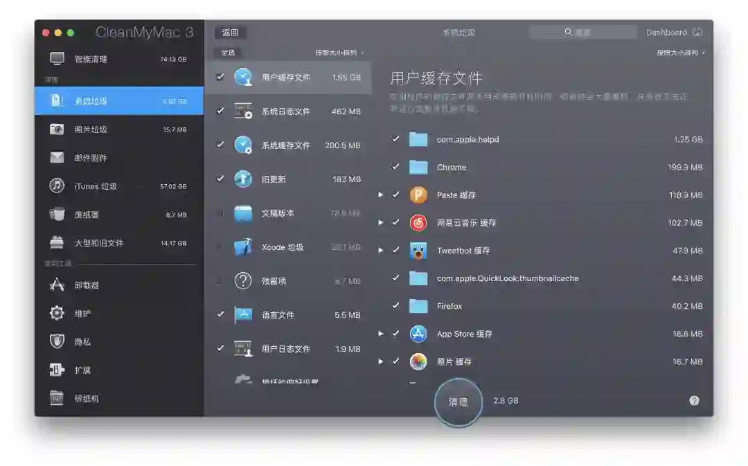 CleanMyMac 3 由 macOS 知名开发商 MacPaw 出品,涵盖垃圾清理、系统维护、文件粉碎等众多实用功能。只要点击底部扫描按钮,等待一小会,你就能获知 Mac 内的缓存、日志、临时文件、iTunes 和照片资料库等占用情况,并一键智能清理。