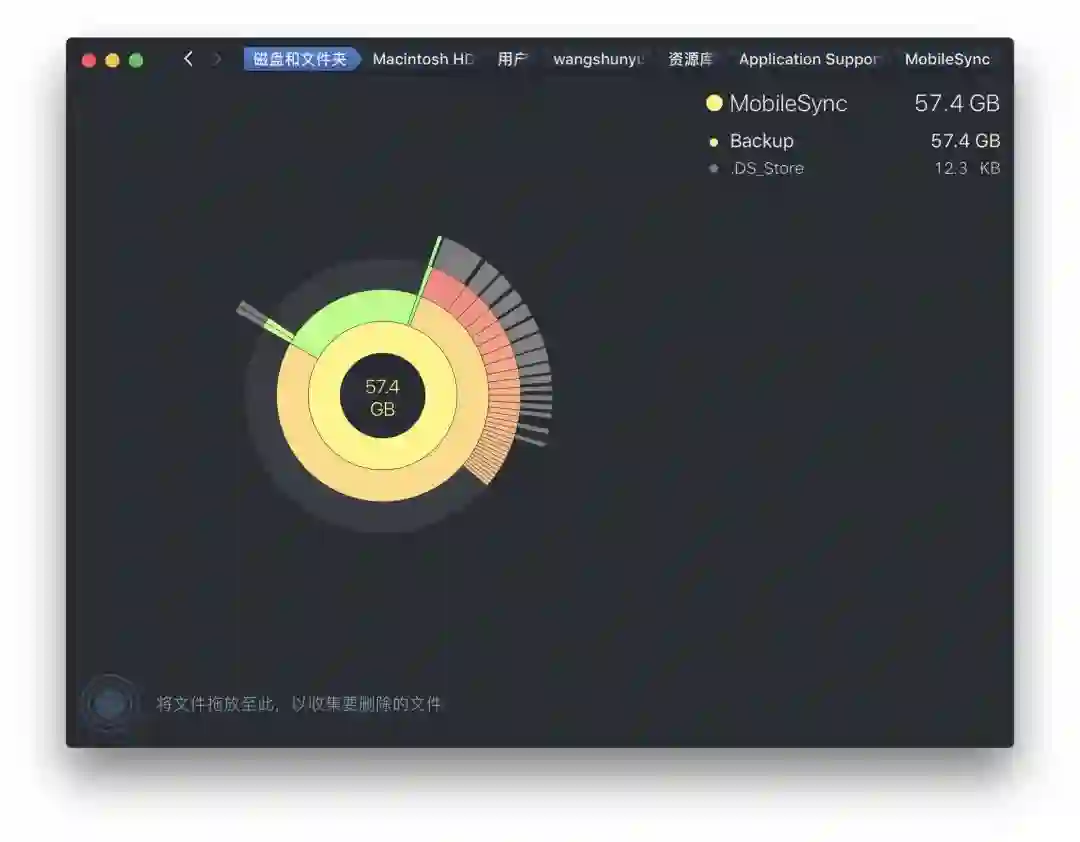 点击任意扇形后,DaisyDisk 就会跳转至当前路径下,只要把其中任意一个文件夹拖到左下角的圆环处,就能收集起来准备一键清除了。为安全起见,系统关键文件夹是不能清理的,有效防止误删。