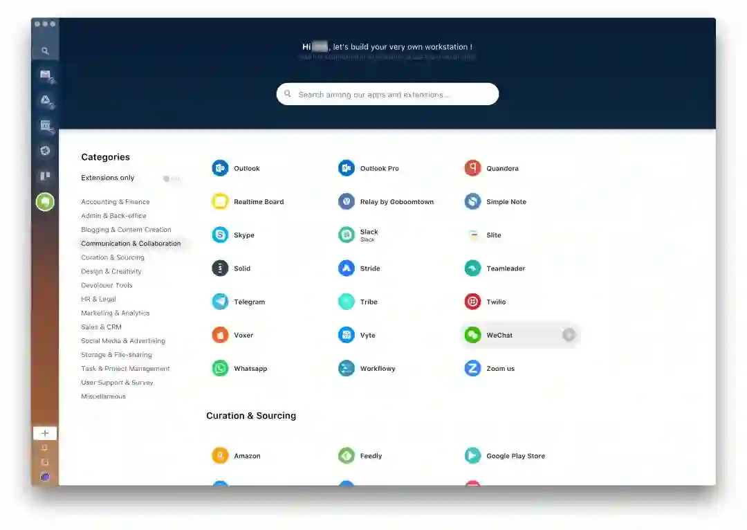 以 Station 为例,你可以从包括微信在内的 400 + 网络服务中自由选择所需项目。授权登录后,就能在一处管理,享受专注模式、统一推送、多账号切换等功能。再也不用为臃肿的 App 所困扰。