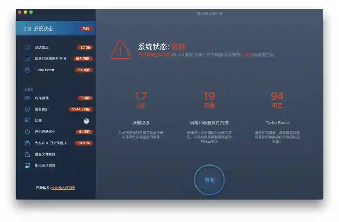 MacBooster 是 AdvancedSystemCare 的开发商 IObit 出品的系统优化软件,除了类似 CleanMyMac 3 的清理功能外,还能查杀病毒、一键加速,可以说是 macOS 版的大数字安全卫士了。