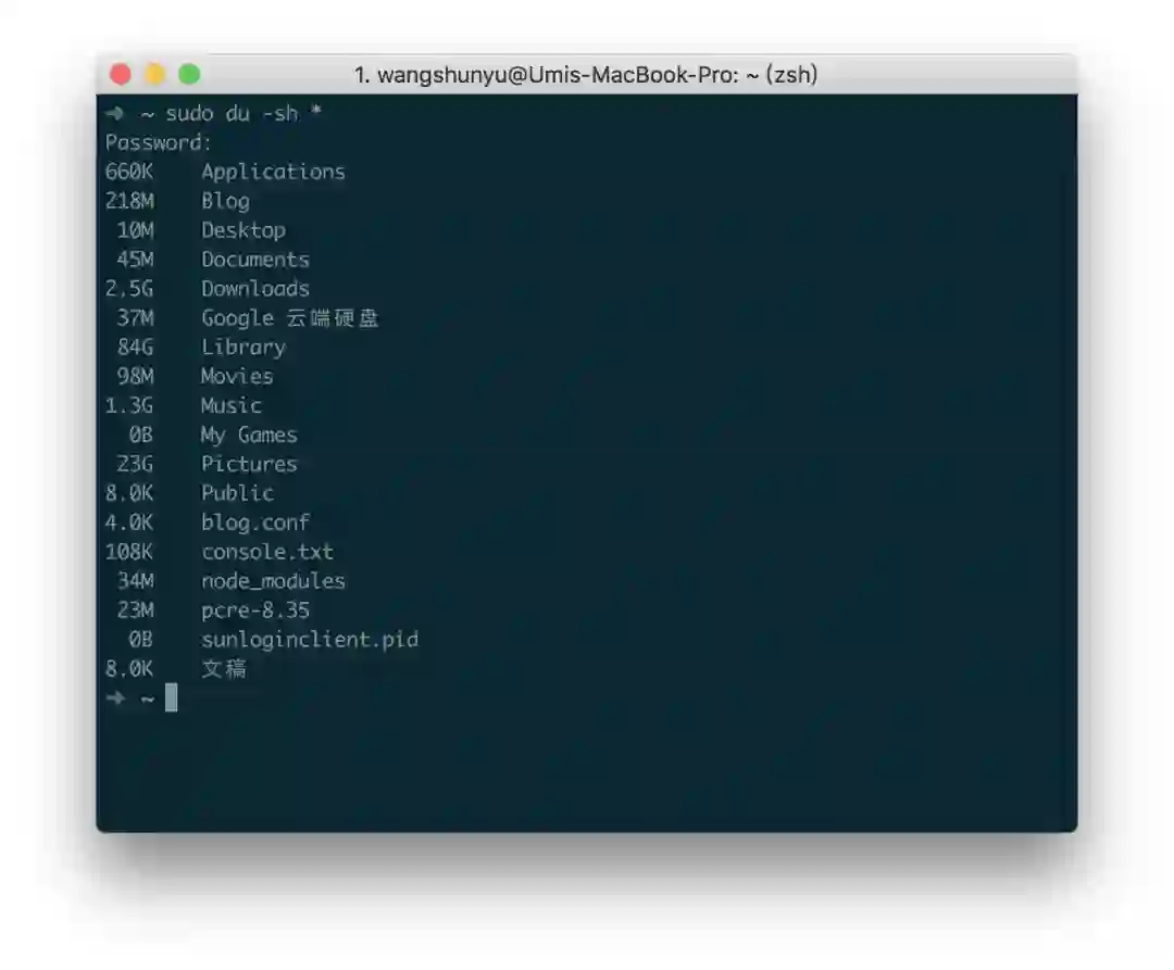 由于 macOS 终端的默认路径是当前用户目录,若想分析其它位置,你需要首先键入 cd /文件夹路径 移驾,然后再次运行 sudo du -sh * 开始扫描。