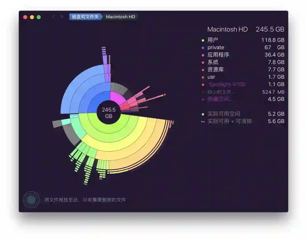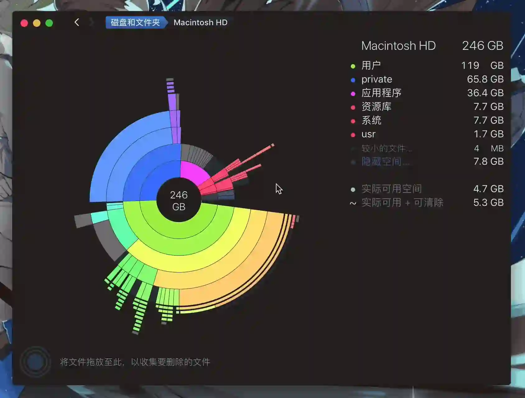 快速筛查完所有本地文件后,DaisyDisk 就会生成如下面的扇形图。并按照目录层级和占用空间排序。其中,最里面的环形就是系统基础文件夹,包括用户、应用程序等组件,因而不建议删除。