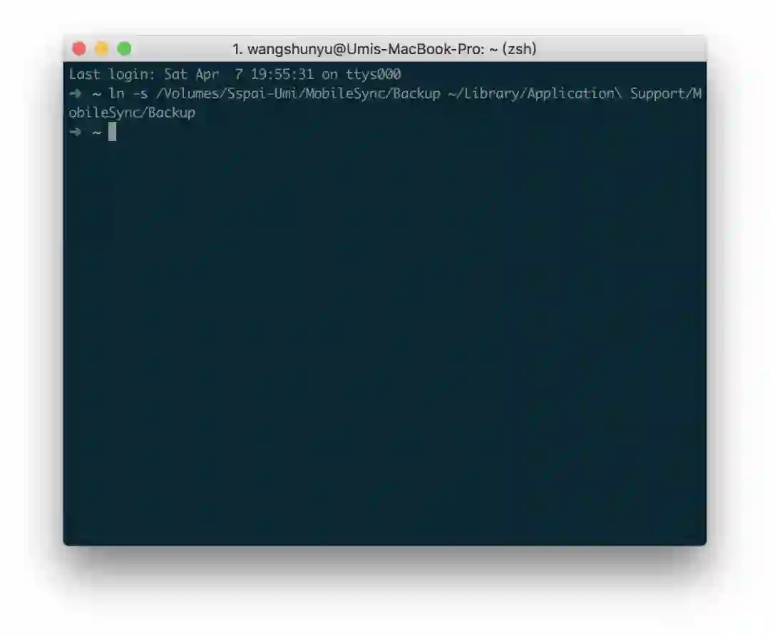 最后,在外接磁盘根目录上创建一个名为 MobileSync 的文件夹,在里层创建一个名为 Backup的文件夹。打开终端,输入 ln -s /Volumes/外接磁盘名称/MobileSync/Backup ~/Library/Application\ Support/MobileSync/Backup并回车。