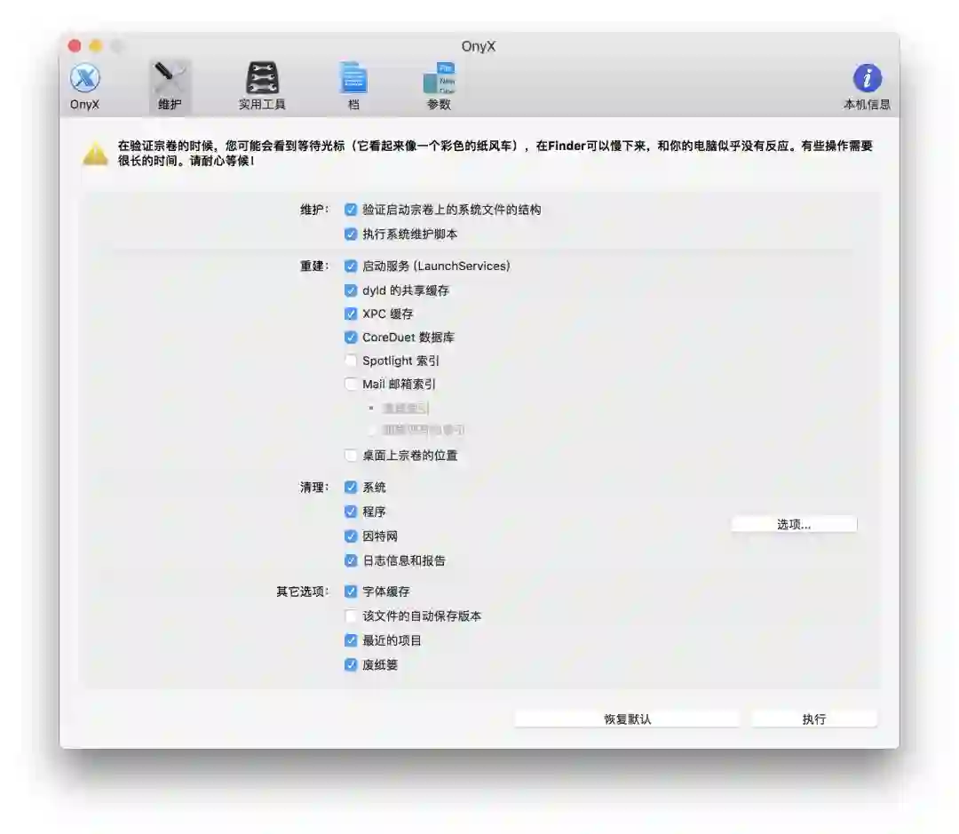 Onyx 是一款极其强大的 macOS 专业系统维护管理工具,受到不少 Power User 的青睐。仅仅在「维护」这一个选项卡中,你就会发现维护文件系统、重建服务功能、清理各类缓存等各类深度优化选项,简单实用。