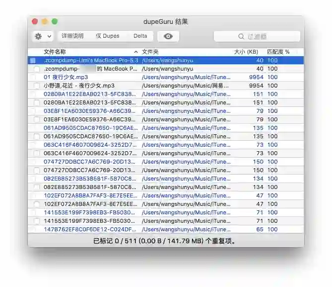 扫描完毕后,dupeGuru 就会显示所有相似文件,并给出其匹配程度。你可以按名称、大小、文件夹等排序,并预览文件信息等。选中所有冗余文件后,就可以准备删除了。
