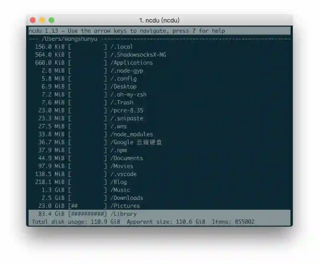 如果你安装了 Homebrew(详细介绍请戳这里),可以直接在终端里输入 brew install ncdu安装。接着,输入 ncdu,其就会自动开始扫描全部磁盘信息,大约需要数分钟就能完毕。