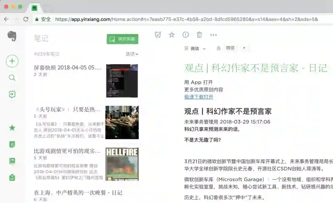 除了卸载低频应用外,我们还可以使用浏览器代替一部分高频应用。例如,我对印象笔记的定位是一款全能收藏服务,而非数字笔记应用。因此,我并不依赖原生 App 所提供的笔记快捷键,而印象笔记 Web 版从 UI 到响应速度等各方面的体验几乎都优于 App。这种情况下,将印象笔记网页固定在浏览器标签栏上随时访问或许更为合适。