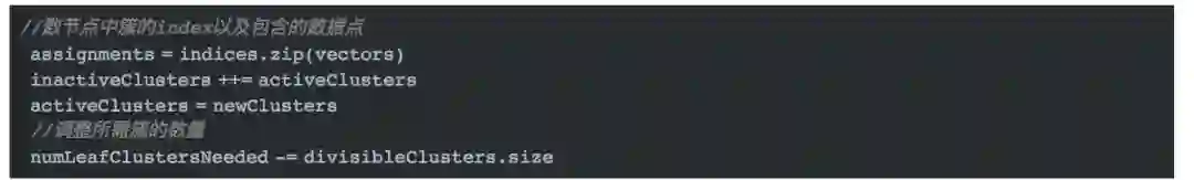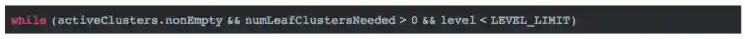 获取第一个簇之后,我们需要做的就是迭代分裂可分裂的簇,直到满足我们的要求。迭代停止的条件是activeClusters为空,或者numLeafClustersNeeded为0(即没有分裂的叶子簇),或者迭代深度大于LEVEL_LIMIT。