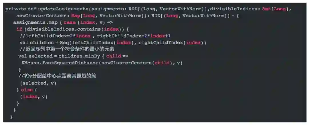 这段代码中,updateAssignments会根据更新的中心点将数据分配给距离其最短的中心点所在的簇,即重新分配簇。代码如下: