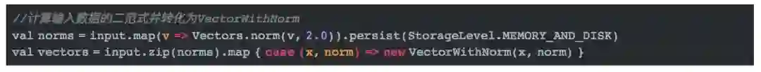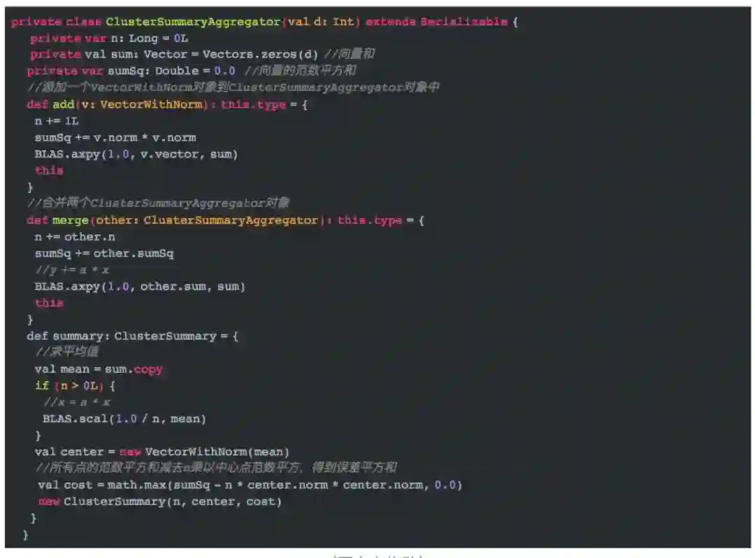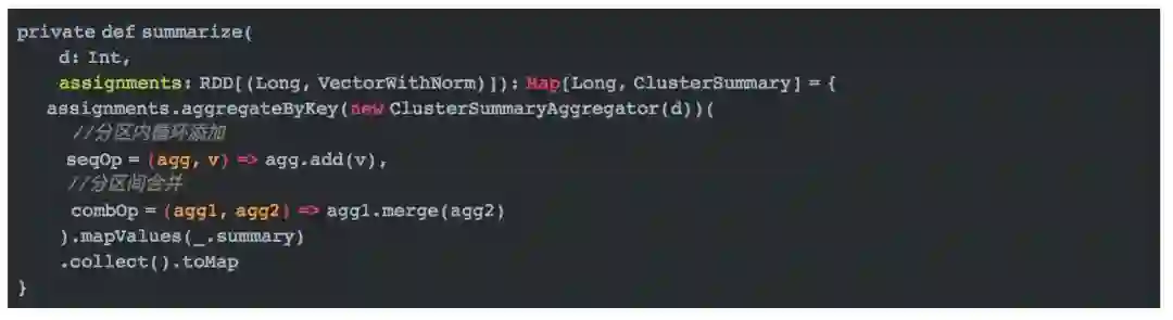 这里的d表示特征维度,代码对assignments使用aggregateByKey操作,根据key值在分区内循环添加(add)数据,在分区间合并(merge)数据集,转换成最终ClusterSummaryAggregator对象,然后针对每个key,调用summary方法,计算。 ClusterSummaryAggregator包含三个很简单的方法,分别是add,merge以及summary。