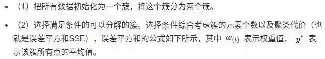 以上过程隐含着一个原则是:因为聚类的误差平方和能够衡量聚类性能,该值越小表示数据点越接近于它们的质心,聚类效果就越好。 所以我们就需要对误差平方和最大的簇进行再一次的划分,因为误差平方和越大,表示该簇聚类越不好,越有可能是多个簇被当成一个簇了,所以我们首先需要对这个簇进行划分。