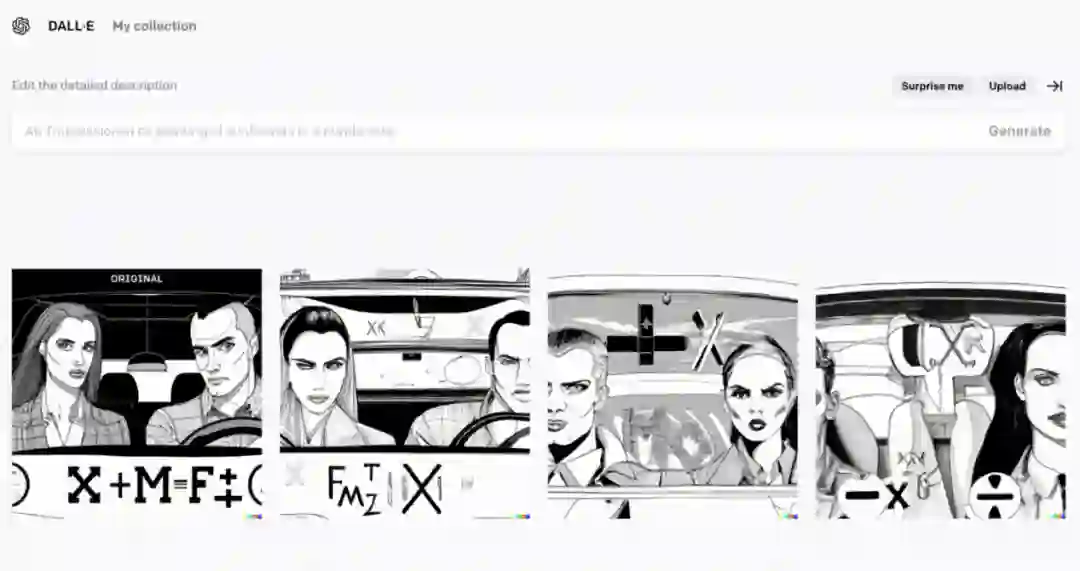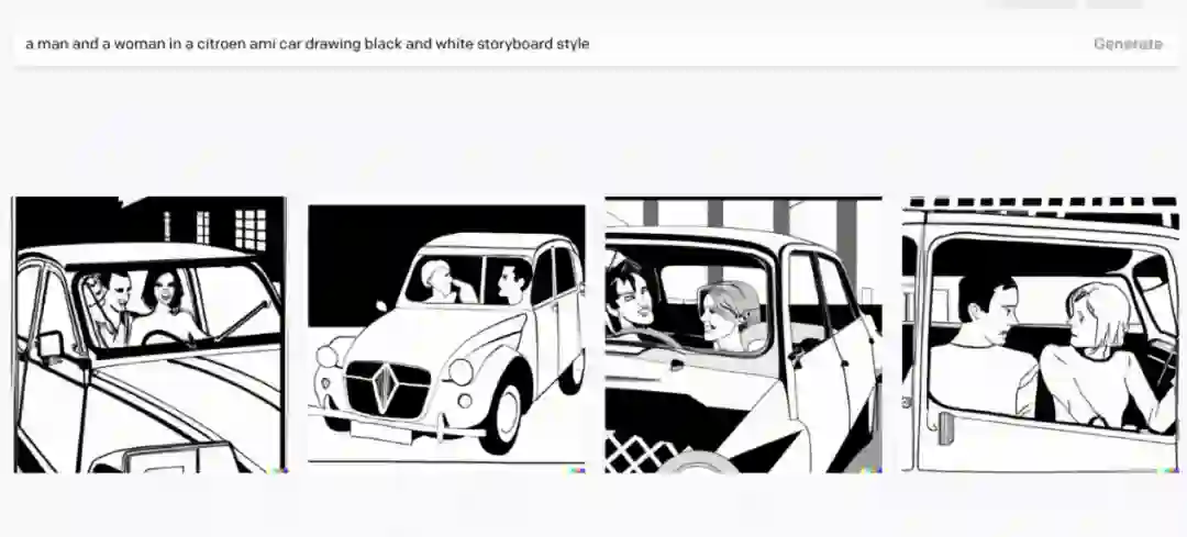 Dall-E软件不知道汽车的确切型号(可能AMi款还比较新)。人物还可以,但不太逼真。而每次获得相同的构图几乎是不可能的。我还意识到,忘了提及许多对设计师来说似乎很直观的细节,比如让人物微笑,让他们目视前方,由女人驾驶,人物要系上安全带等等...