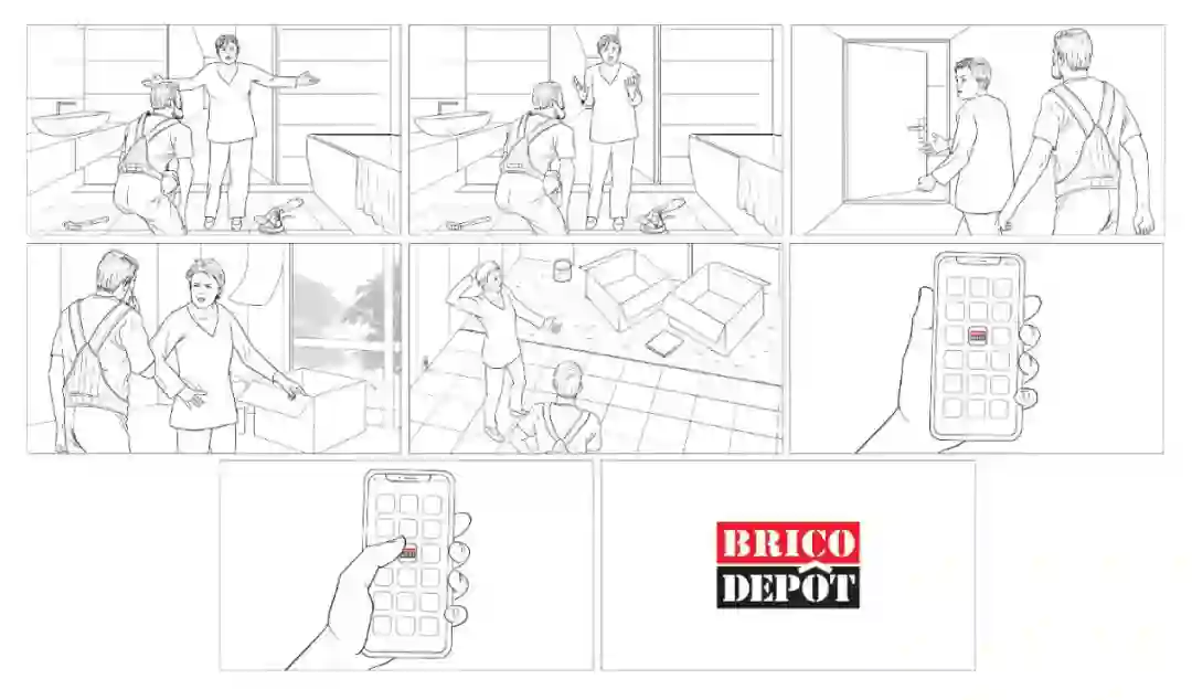 故事板是一个专业的手段,用于对项目有一个连贯的愿景。它不能是不精确的,近似的。我甚至不想让同一个人物有不同而醒目的表情,就像我为Brico Depot做的这个故事板: