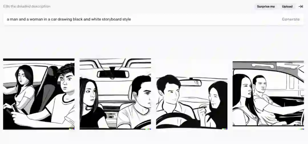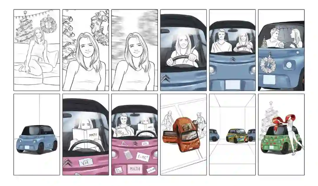 现在想象一下,必须一次又一次地做这个过程,最后得到一个由下面12张图片组成的连贯的故事板,在不同的角度有相同的人物和汽车。