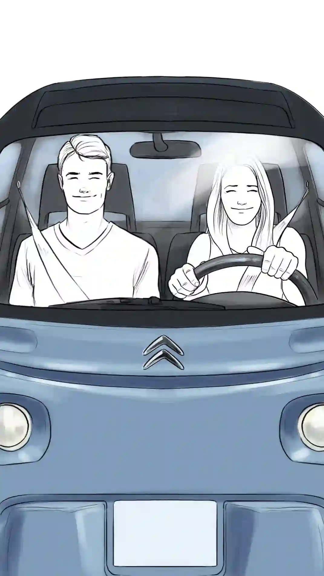 如您所见,这似乎非常 "容易 "描述。一个男人和一个女人,在一辆雪铁龙Ami款汽车里,正面的前视图。我甚至可以不介意汽车的颜色是蓝色的,人物是白色的。只是想看看是否能用Dall-E得到类似的东西。结果比我预期的要好,但对于客户来说,确实远远不够用。以下是用不同描述得到的一些结果: