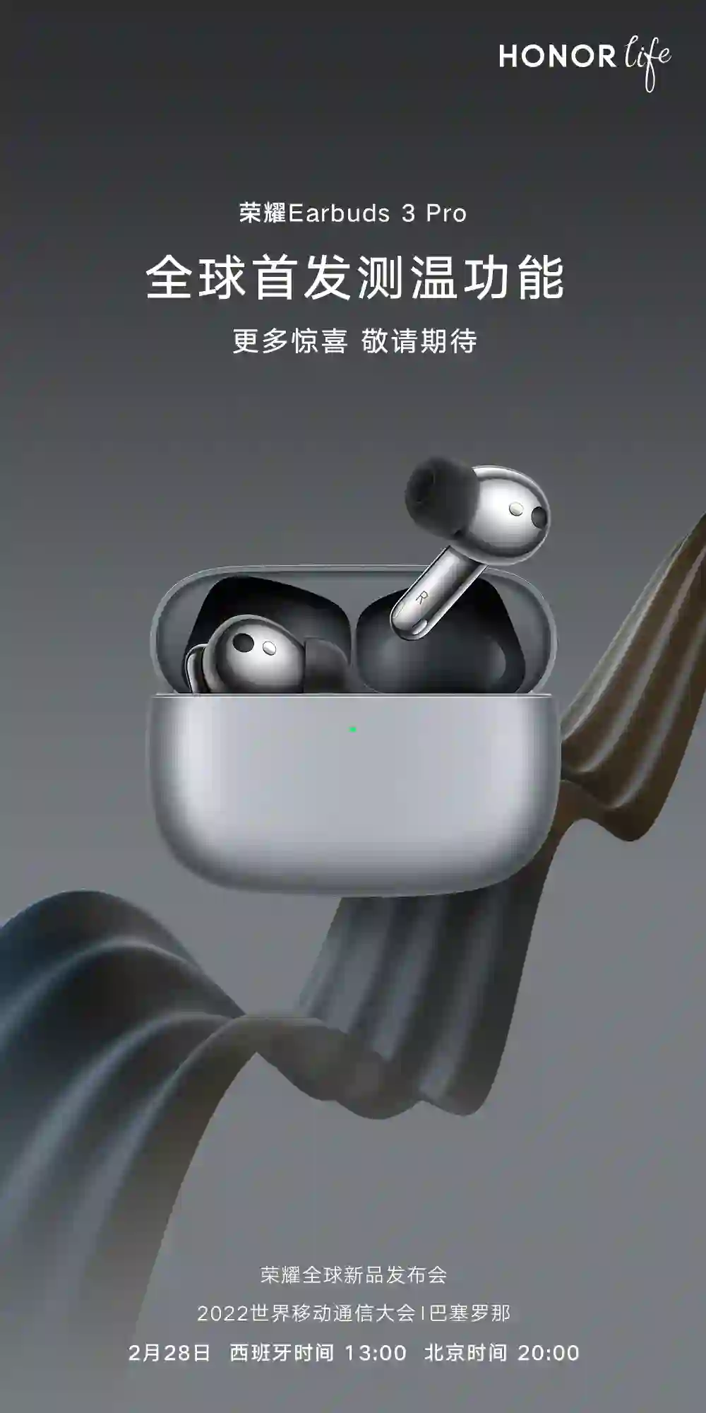 而今日,荣耀再次官宣 28 日荣耀全球新品发布会将会带来 Earbuds 3 Pro 真无线耳机。从海报可以看出,这款耳机采用入耳式设计,外观较为圆润,与荣耀 Earbuds 2 SE 采用类似设计。另外,这款耳机会全球首发测温功能,并被称为是“一部有‘温度’的产品”。