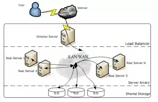 每个 Real Server 之间通过高速的 LAN 或分布在各地的 WAN 相连接。在实际的应用中,Director Server 也可以同时兼任 Real Server 的角色。