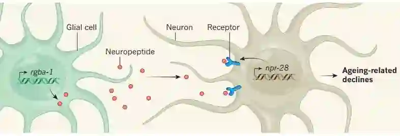 研究者发现,线虫(Caenorhabditis elegans)神经胶质细胞rgba-1基因产物会产生4种不同类型的神经多肽,其从胶质细胞中释放出去,与由神经元细胞基因npr-28表达的受体结合起来,进而调控线虫的衰老速度。主要体现在如下几个指标:生殖、摄食、运动能力的下降。RGBA-1神经肽会激活多巴胺能神经元和血清素能神经元上的NPR-28受体,加速细胞衰老。这条信号通路还可减少线粒体非折叠蛋白反应(UPRmt)激活,具体是通过SIR-2.1通路,加速细胞的衰老。