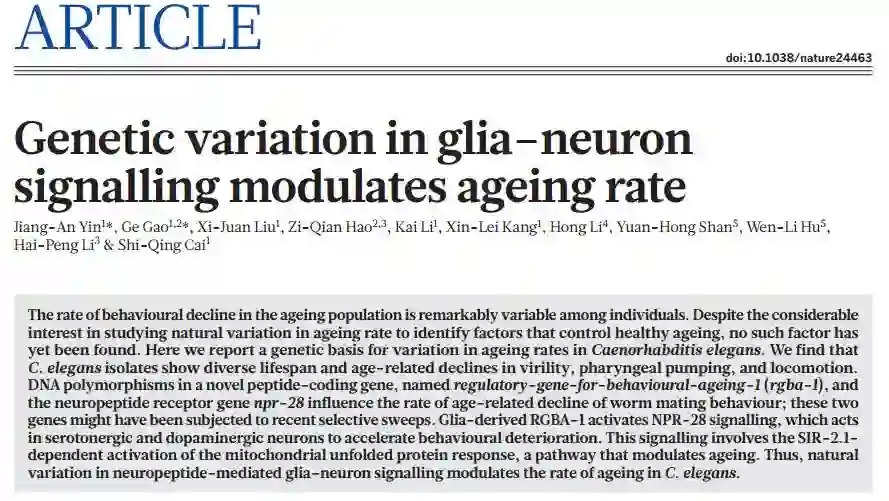 每个人都会衰老,但有些人衰老得慢一点,有的人会快一些,还有一些罕见的遗传突变会导致早衰,如儿童的早老症(Progeria)。尽管研究者对衰老的自然变异非常感兴趣,但目前尚未找到相关因子调控这一过程。11月9日,国际著名学术杂志《自然》,在线发表了中国科学院神经科学研究所蔡时青课题组有关衰老方面的论文:Genetic variation in glia–neuron signalling modulates ageing rate。研究者发现,大脑神经胶质细胞突变会改变衰老的速率,简单来说,研究者发现了两个与衰老有关的遗传突变,它们会降低线虫的交配和摄食行为。通过进一步的研究发现,这两个遗传突变会调控动物的神经活动。这项研究为我们了解衰老机制提供了新的见解。
