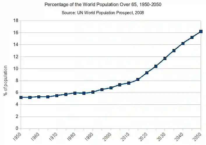 ► 全球超过65岁的老人比例,迅速攀升,图片来自wikipedia