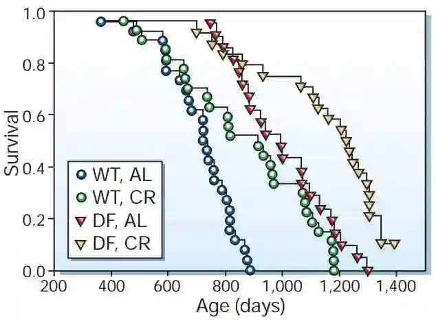 那么,该如何保持健康长寿?通过上图我们可看到遗传作用和饮食对小鼠的寿命影响很大,携带有长寿基因的小鼠(DF)要比普通小鼠(WT)寿命长,同时严格控制饮食,使其“食不过饱”,比普通小鼠饮食更少,小鼠的寿命显著延长。由此可见,寿命的长短并非仅是“听天由命”,饮食以及运动也会影响寿命。